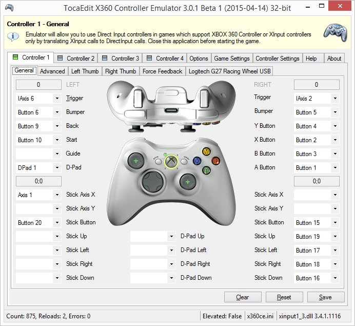As for mapping the output of the driver to something games understand, you’ll need yet another tool: x360ce. This translates whatever output you get from a driver, and makes the game/program in question think there’s an Xbox360 controller attached. For details on how x360ce works, check the github site.