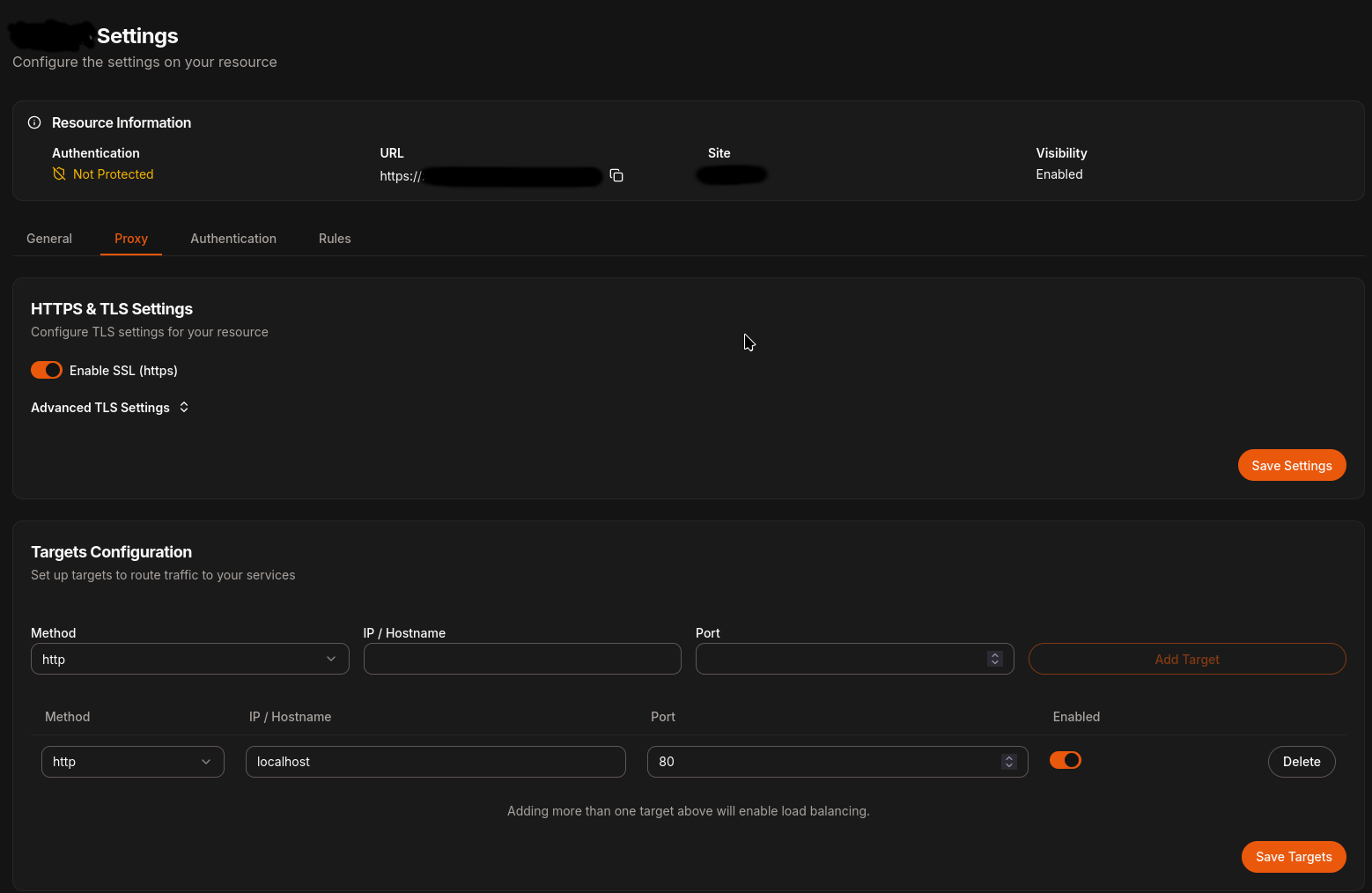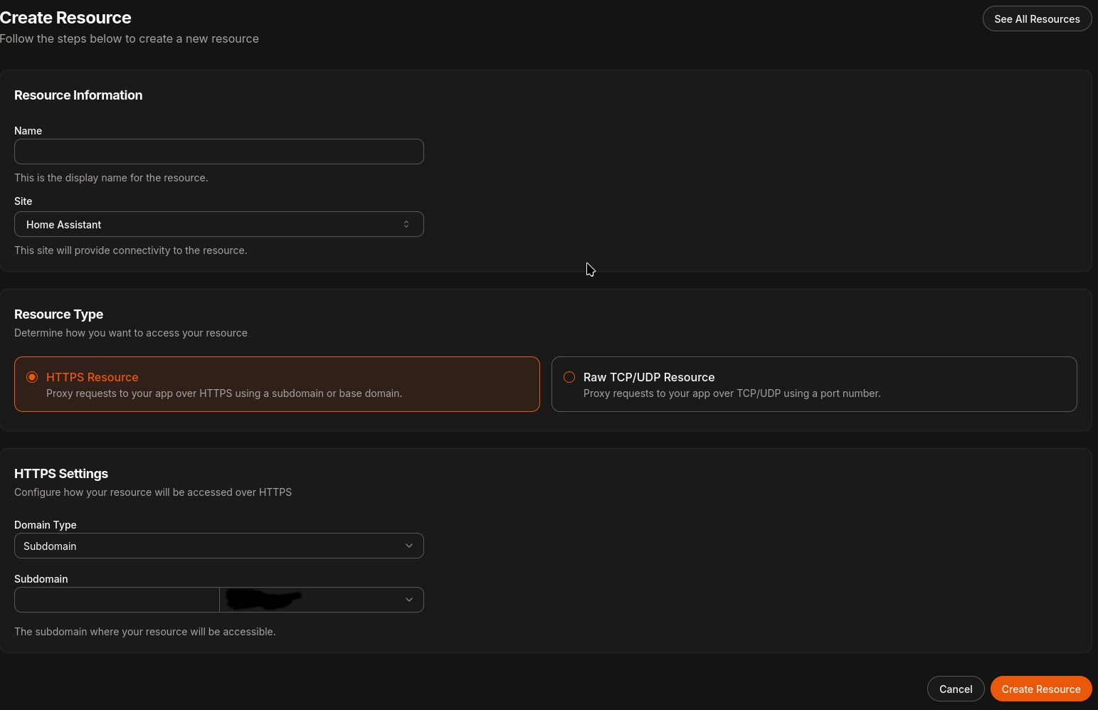 Select ‘Resources’, choose the site you added in step 1, pick HTTPS resource, and add the subdomain you want it to be available on.