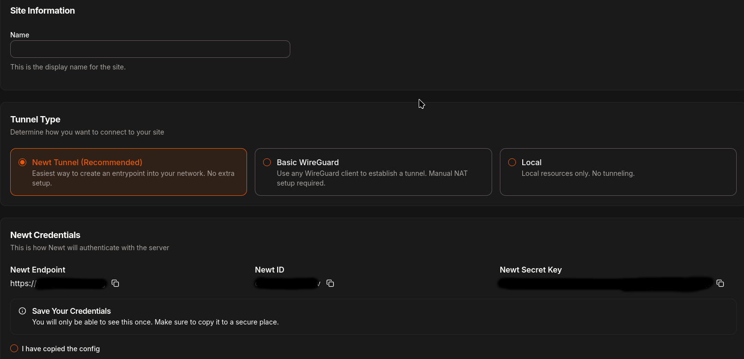 Add a site, selecting your tunnel type (eg. Newt), and write down the